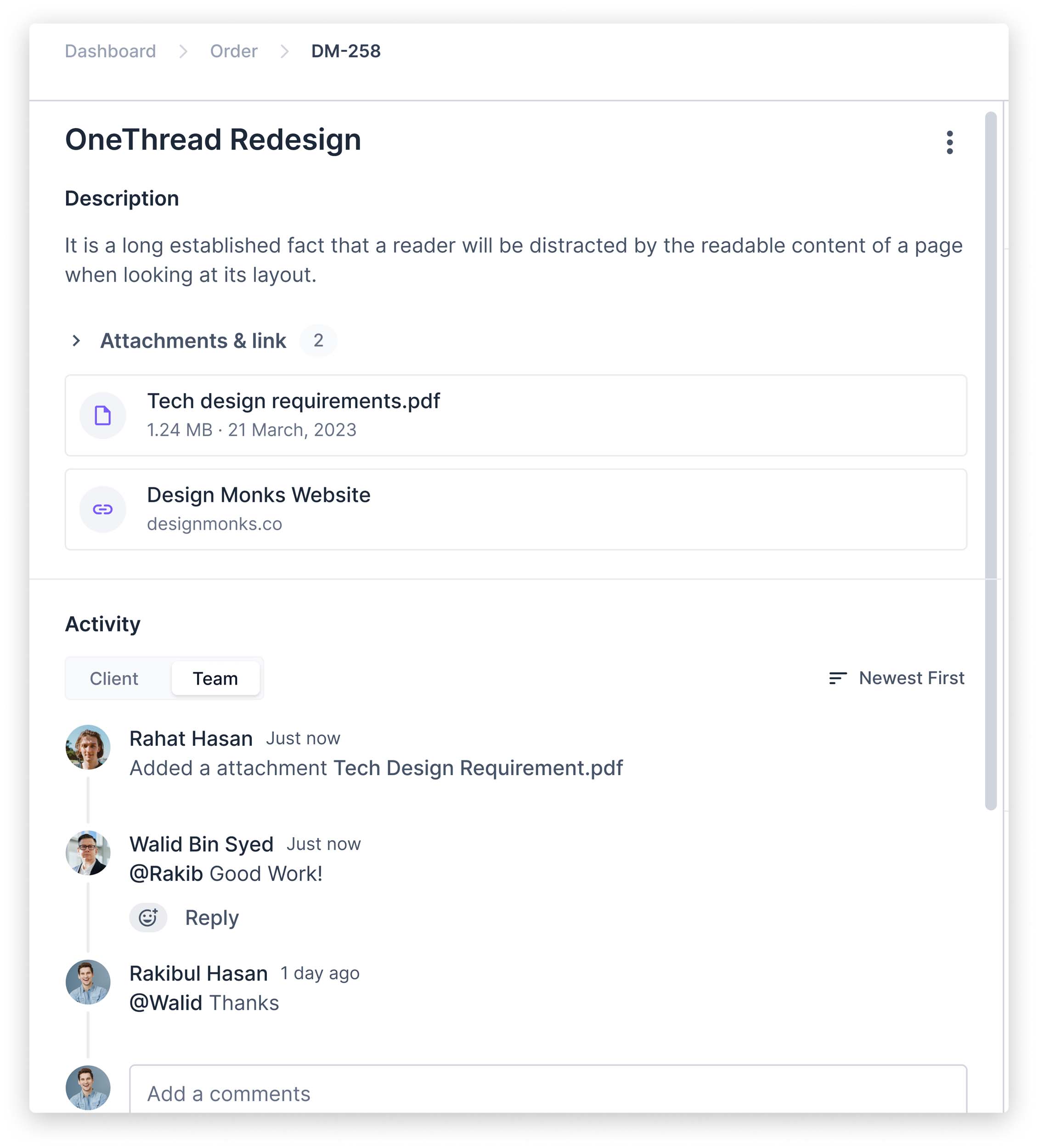 As an owner, you can break an order into smaller tasks, assign them to your team, and follow up on the progress. You can get customer feedback and approval on each task to make sure all the deliverables meet the required quality.