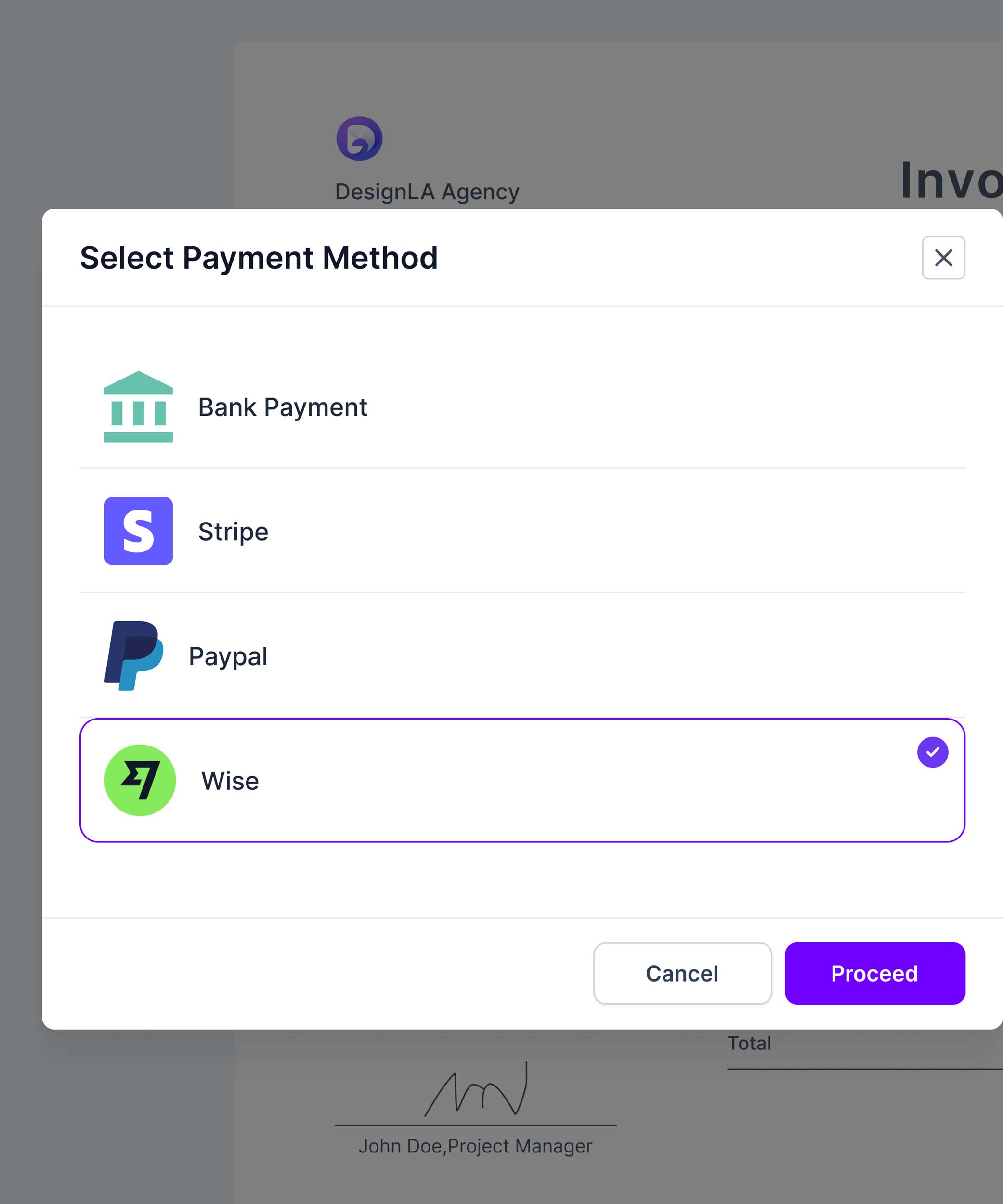 Custom orders mean there are unique invoices every time as well. You can create & send an invoice to your client for the custom proposal from Agency Handy as well. Integrate your payment link (Stripe) for clients to directly pay you from the invoice.