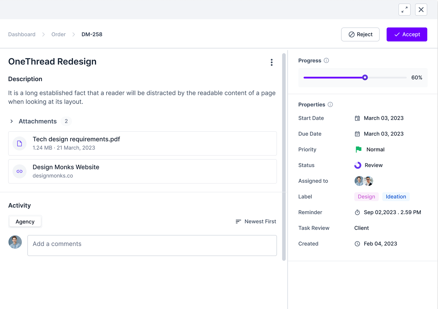 Moreover, the platform features an advanced file feedback feature. You can add annotations to file uploads for easy collaboration on orders. Both client and team members can make comments to files and access version history, so you can always restore a previous version.