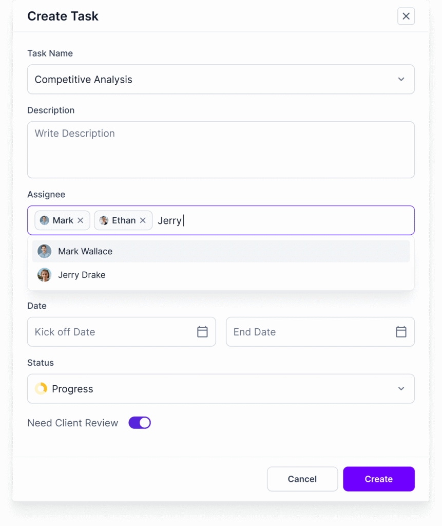 - Client Task Creation: This is about keeping clients accountable. You need the ability to assign tasks to your client, like “Approve this mockup” or “Upload the brief,” with a clear due date to keep the project from stalling.