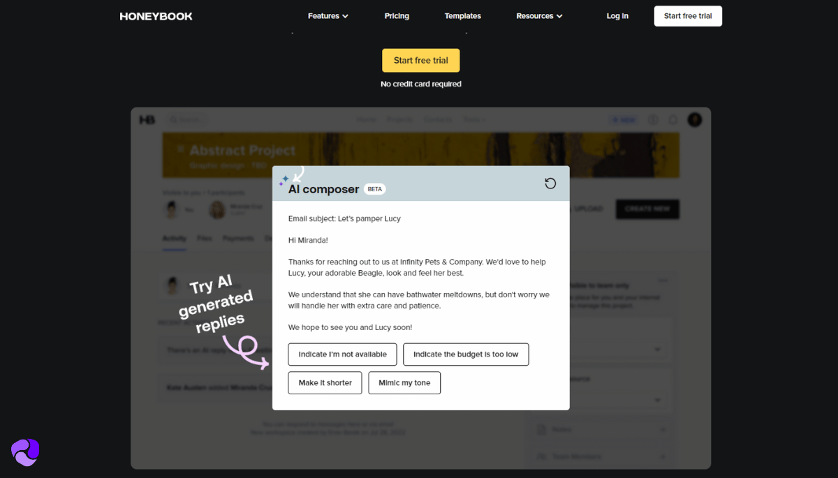 HoneyBook also offers AI tools to simplify client management. You can send personalized messages, create images, and get notified about promising leads, all of which can enhance your productivity and brand presence.