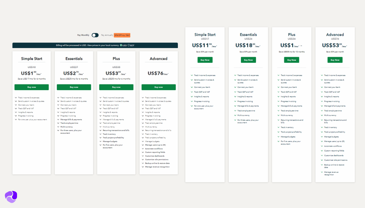 Note: The pricing taken for QuickBooks is the pricing option given for Accountants. QuickBooks has a different set of pricing for Small Businesses, starting with Simple Start at $11.20/month.