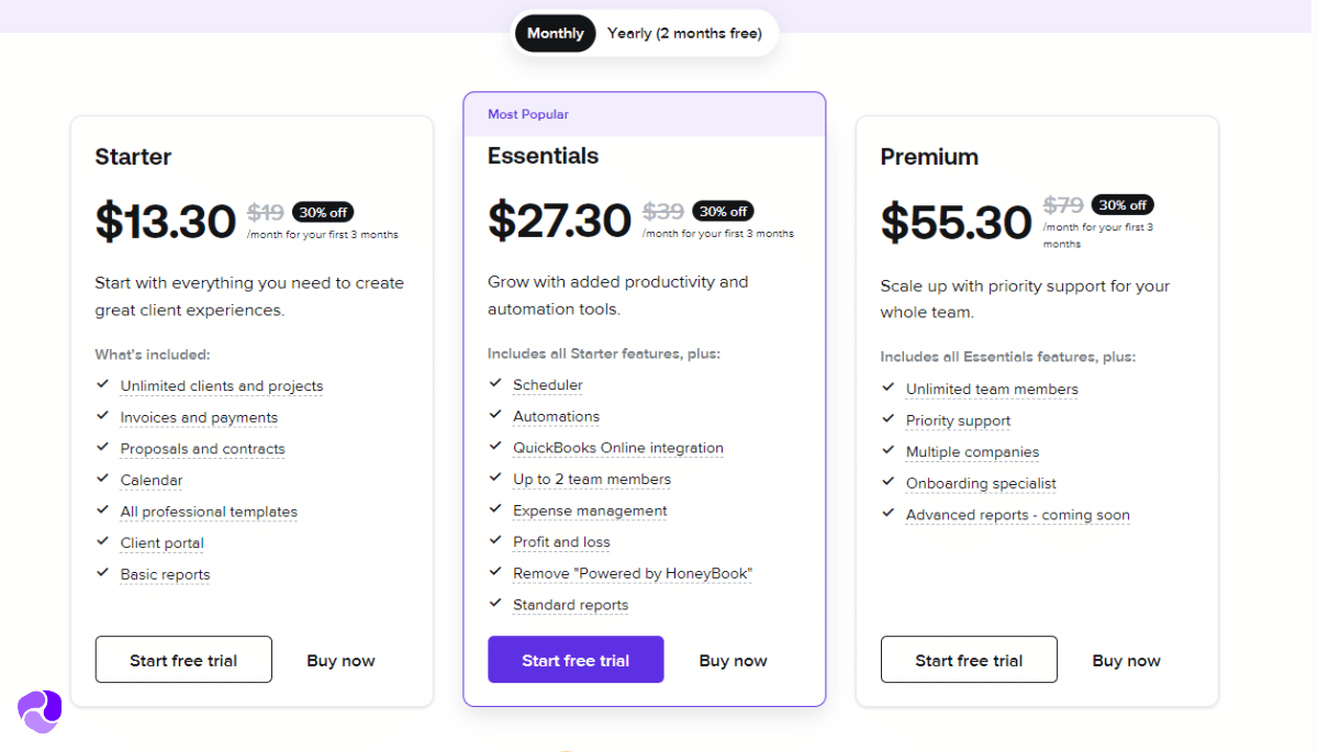 This plan includes up to 2 team members, a scheduler, QuickBooks integration, removal of the ‘Powered by HoneyBook’ branding, standard reports, automation, expense management, and profit and loss reporting.