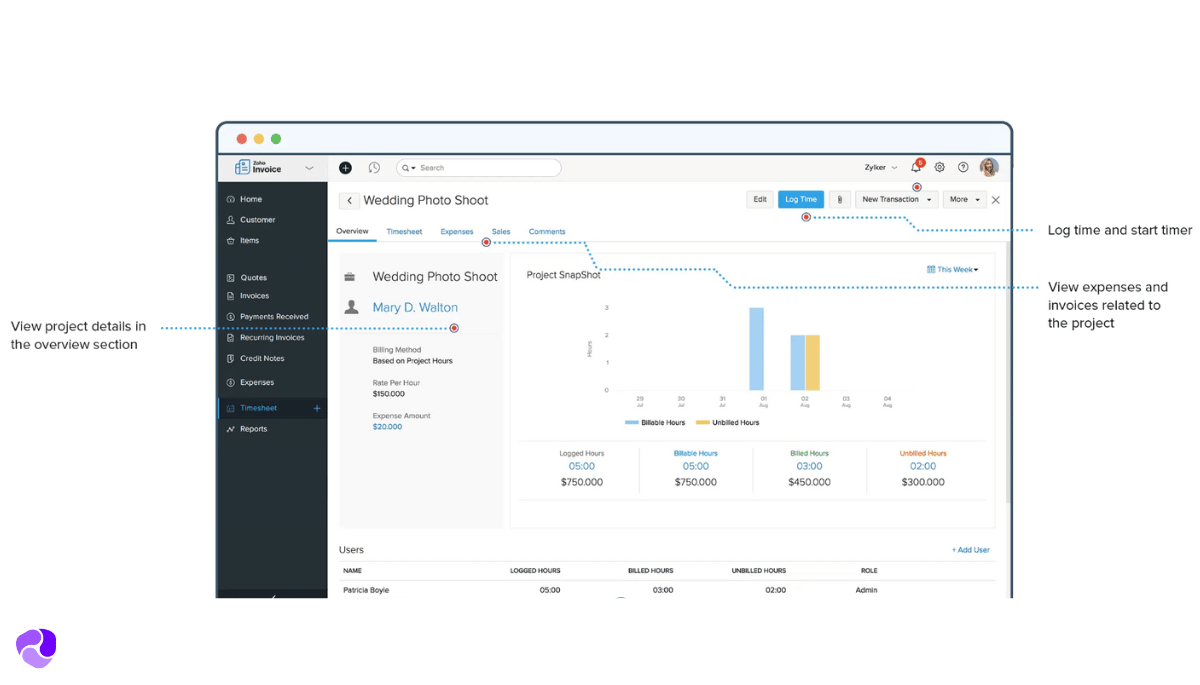 - Project Management: Create and track projects, billing based on tasks or overall projects. Monitor unbilled hours and expenses to ensure accurate invoicing and project profitability.